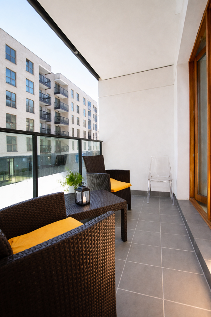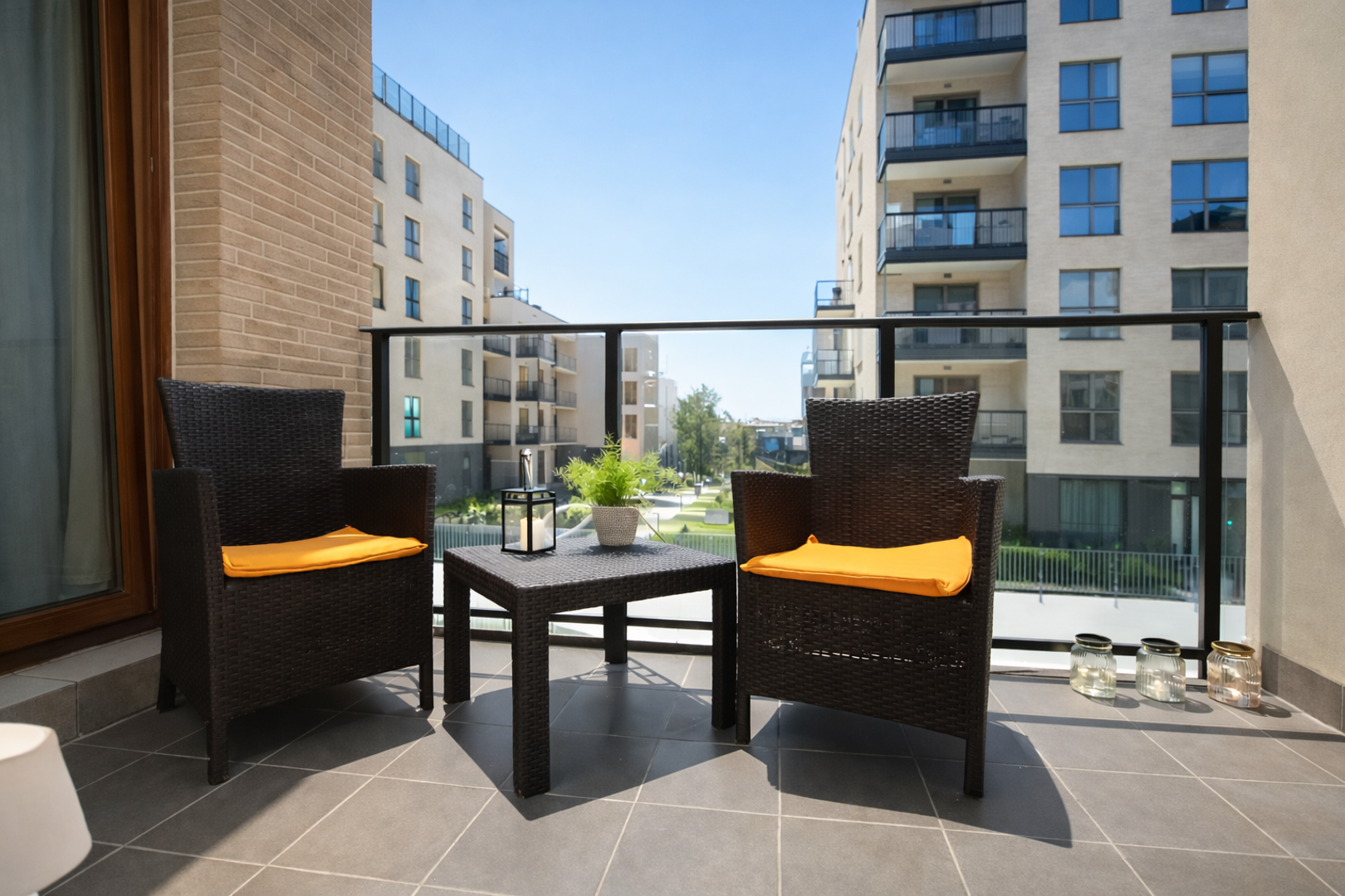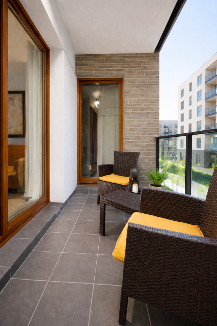 Przestronny balkon (ok. 6 m²) z wyjściem zarówno z salonu, jak i sypialni. Wyposażony w stolik i krzesła – idealne miejsce na relaks.