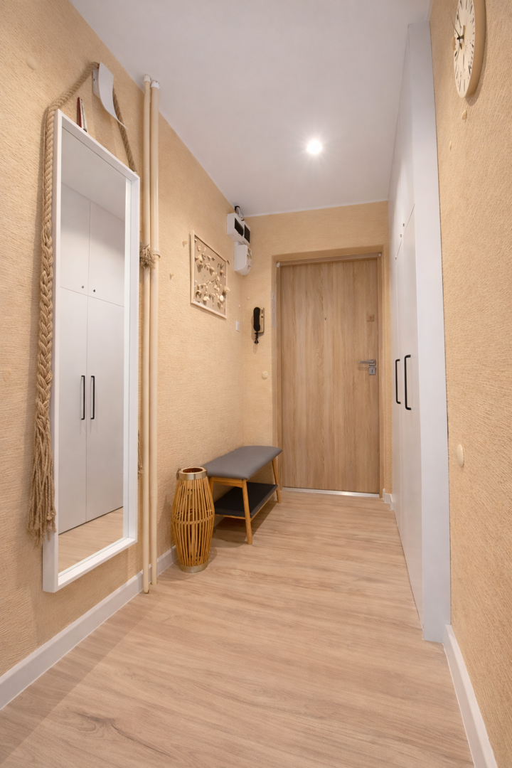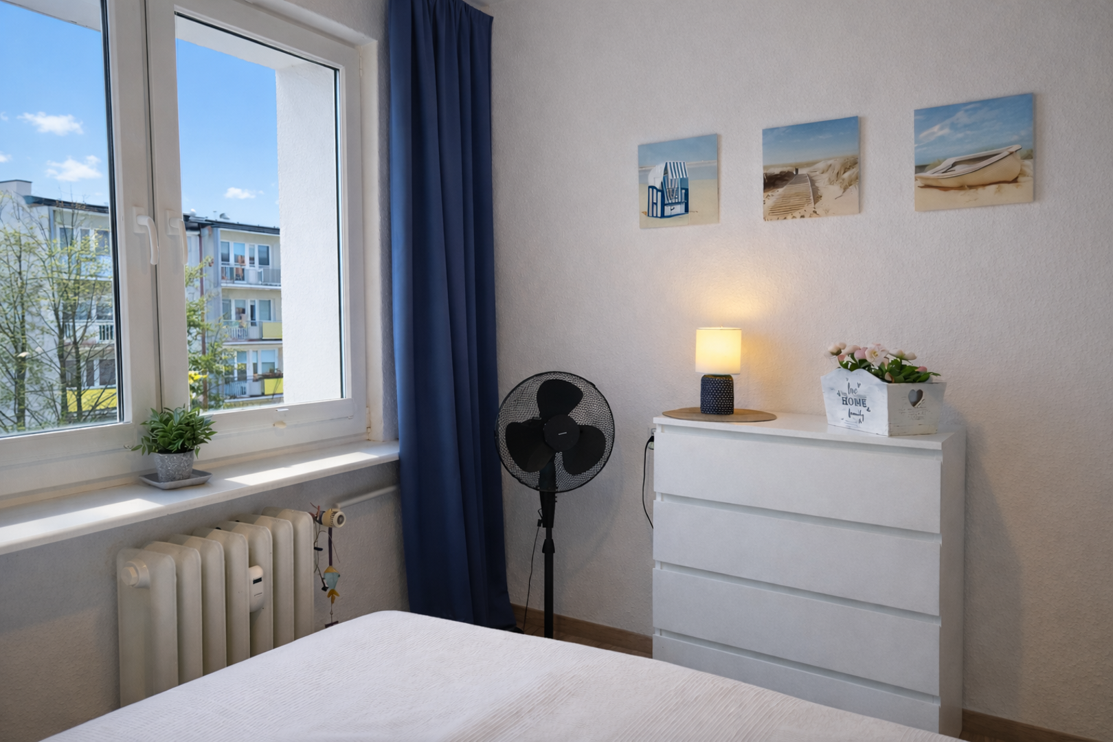 Wnętrze jest jasne, słoneczne i przewiewne, co zapewnia komfortowy wypoczynek nawet w cieplejsze dni. W każdym pomieszczeniu znajduje się wentylator podłogowy. Mieszkanie jest starannie przygotowane – czyste, świeże i gotowe na przyjęcie gości.