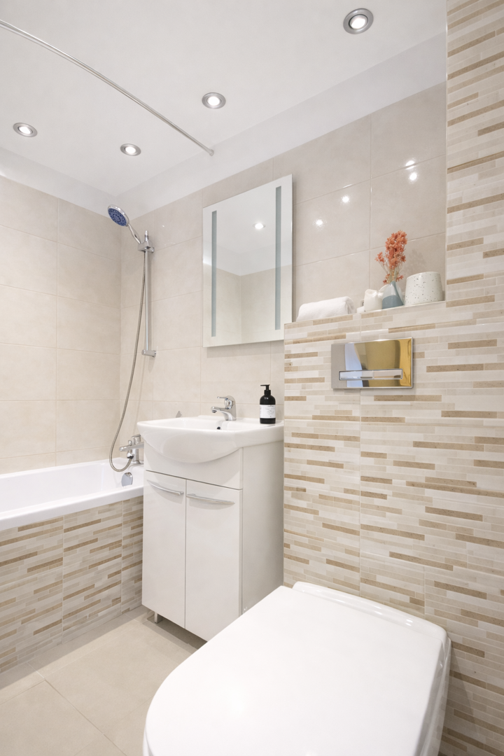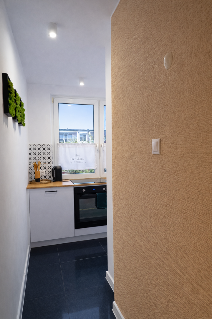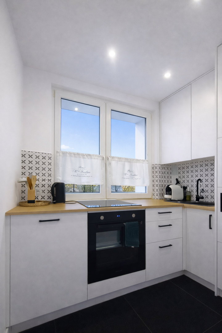 Mieszkanie jest odnowione i utrzymane w bardzo dobrym stanie technicznym. Nowoczesna kuchnia wyposażona jest w wysokiej klasy sprzęt AGD: zmywarkę, płytę indukcyjną, piekarnik, czajnik elektryczny oraz ekspres do kawy. Do dyspozycji gości pozostaje pełen zestaw naczyń, sztućców i akcesoriów kuchennych, a także podstawowe przyprawy, środki czystości, herbata oraz kapsułki do kawy.