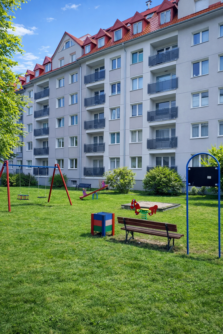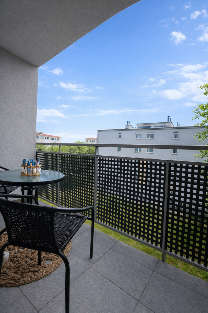 Do dyspozycji gości jest także balkon z wyjściem z salonu, wyposażony w stolik i krzesła – idealne miejsce na poranną kawę lub wieczorny relaks. Widok na zieleń, plac zabaw oraz spokojną okolicę. Wszystkie okna wyposażone są w rolety/żaluzje oraz zasłony.