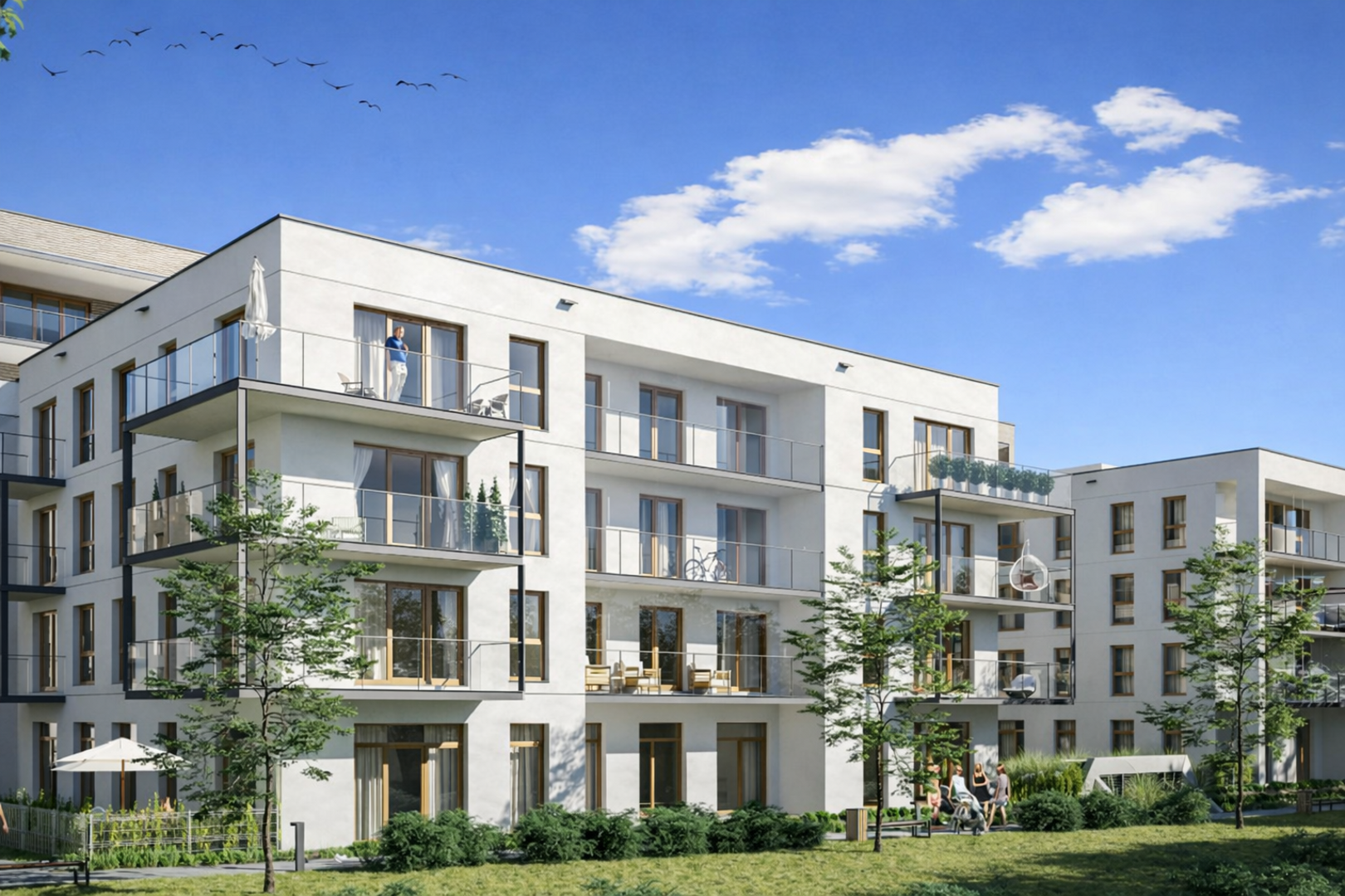 Przytulny balkon z widokiem na zielony dziedziniec. Wyposażony w zestaw balkonowy – idealne miejsce na poranną kawę lub wieczorny relaks.