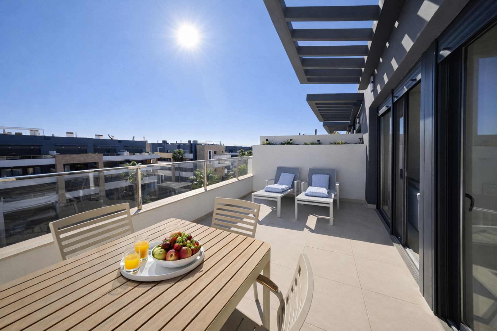 Duży taras z widokiem na dziedziniec osiedla i baseny. Wyposażony w stół z krzesłami oraz leżaki.