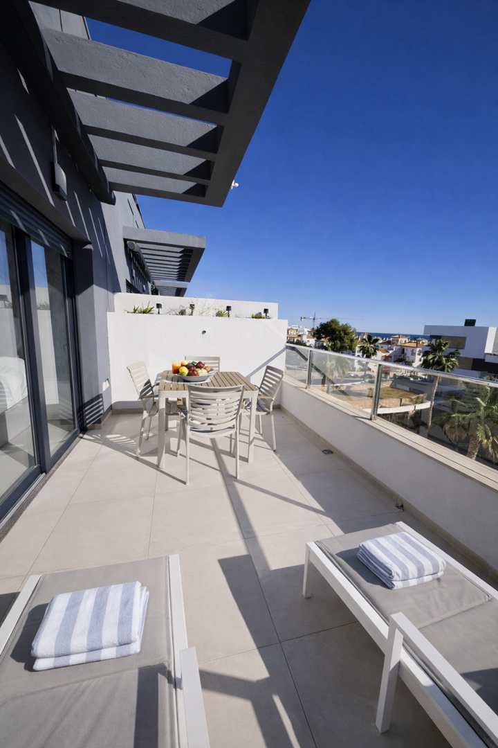 Nowoczesny i przestronny apartament z dwoma tarasami, położony na ostatnim, najwyższym piętrze prestiżowego kompleksu Flamenca Village w La Zenia.