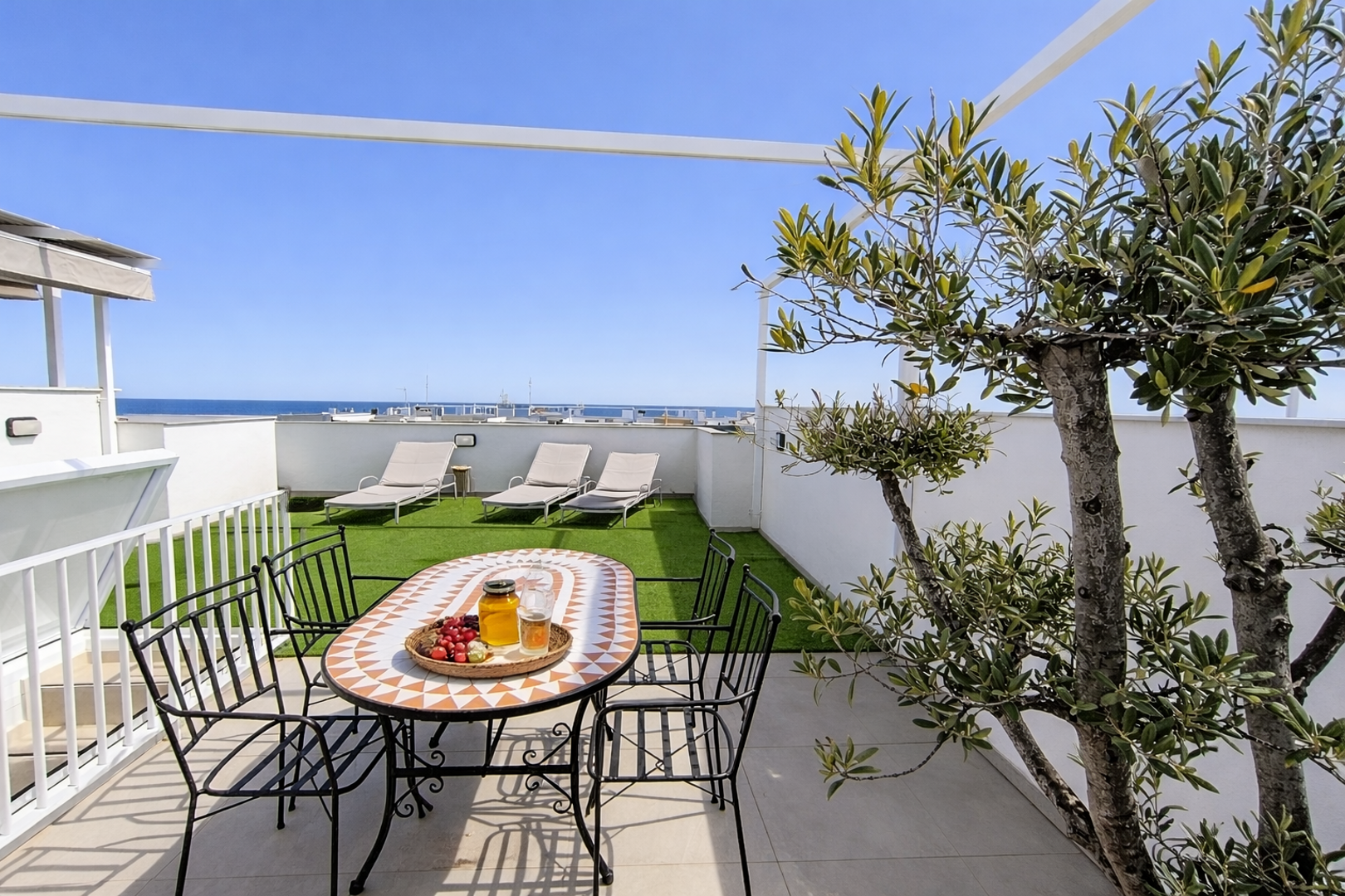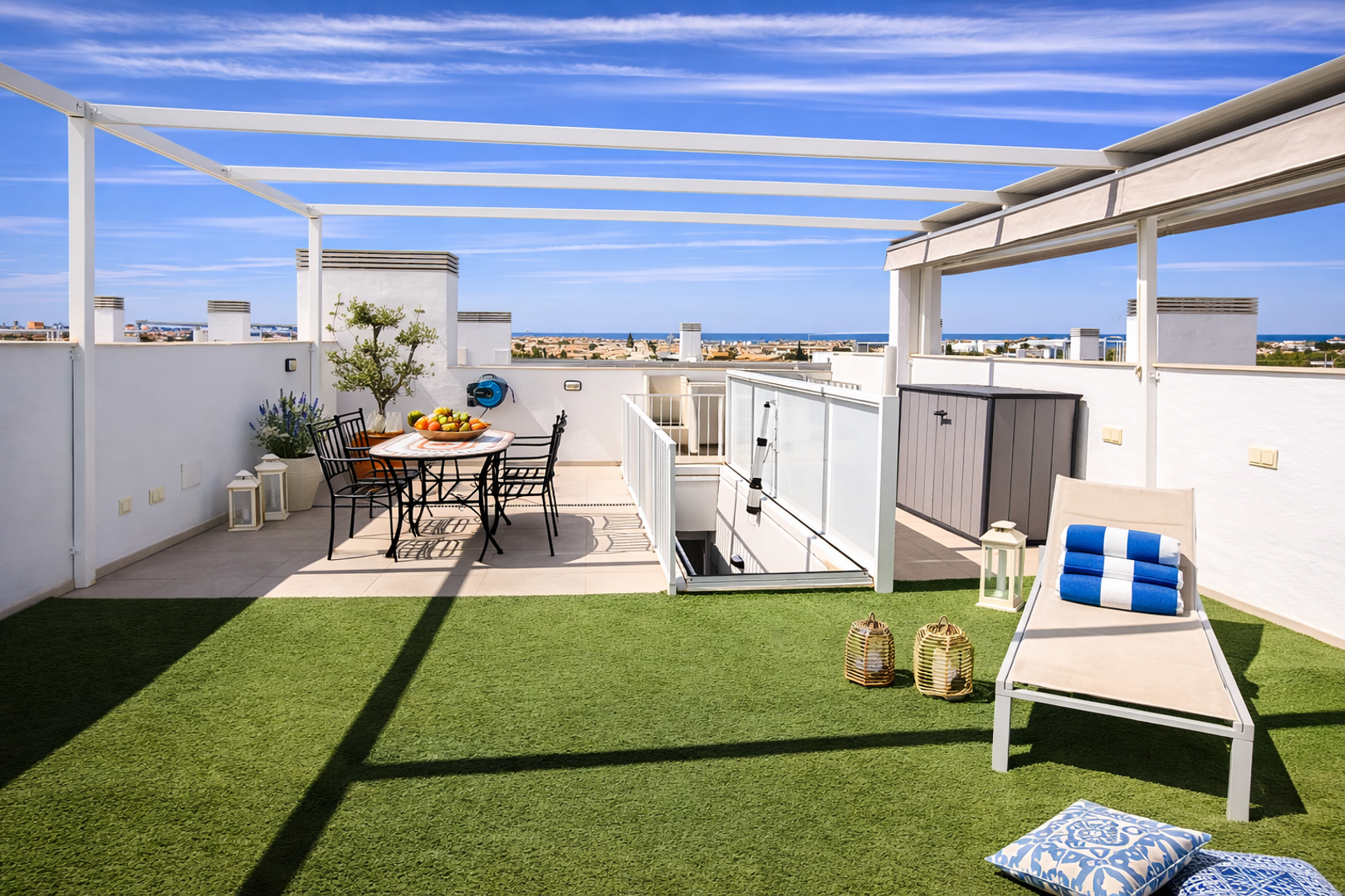 Apartament składa się z dwóch poziomów. Na górnym poziomie znajduje się ogromny taras z kuchnią letnią, leżakami oraz stołem z krzesłami pod markizą. Z tarasu rozciąga się widok na całe osiedle, okoliczną zabudowę oraz morze. Na tarasie znajduje się również prysznic letni.