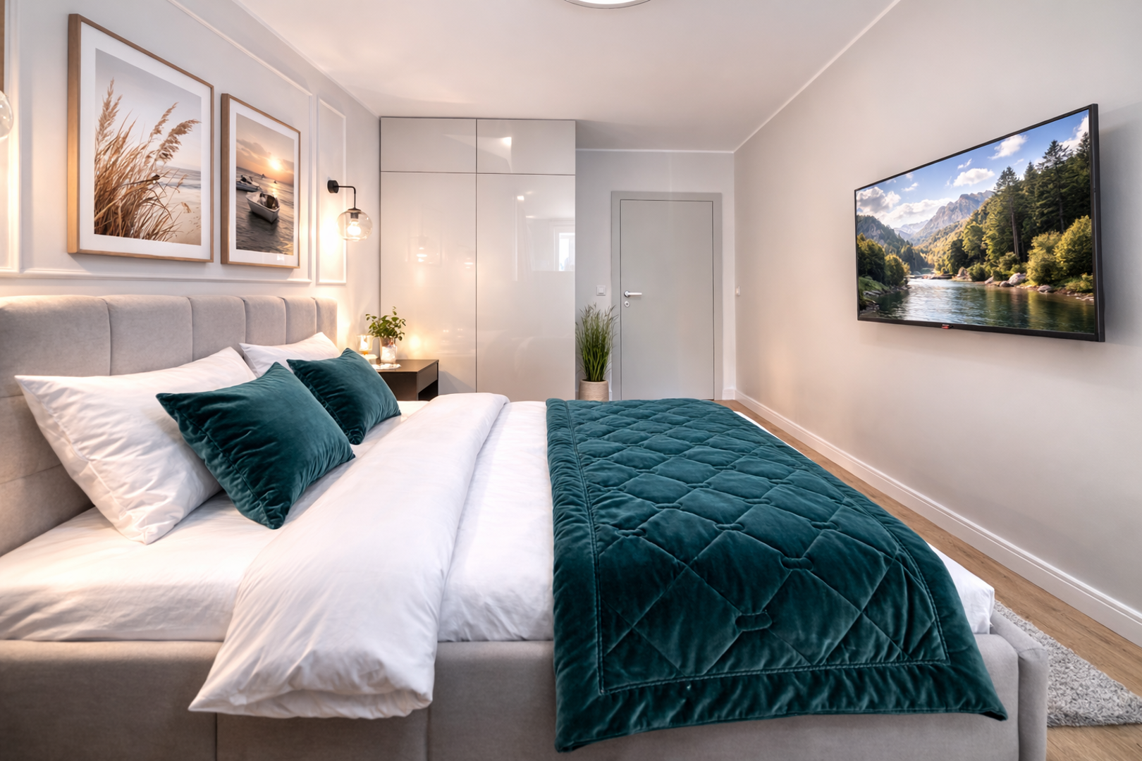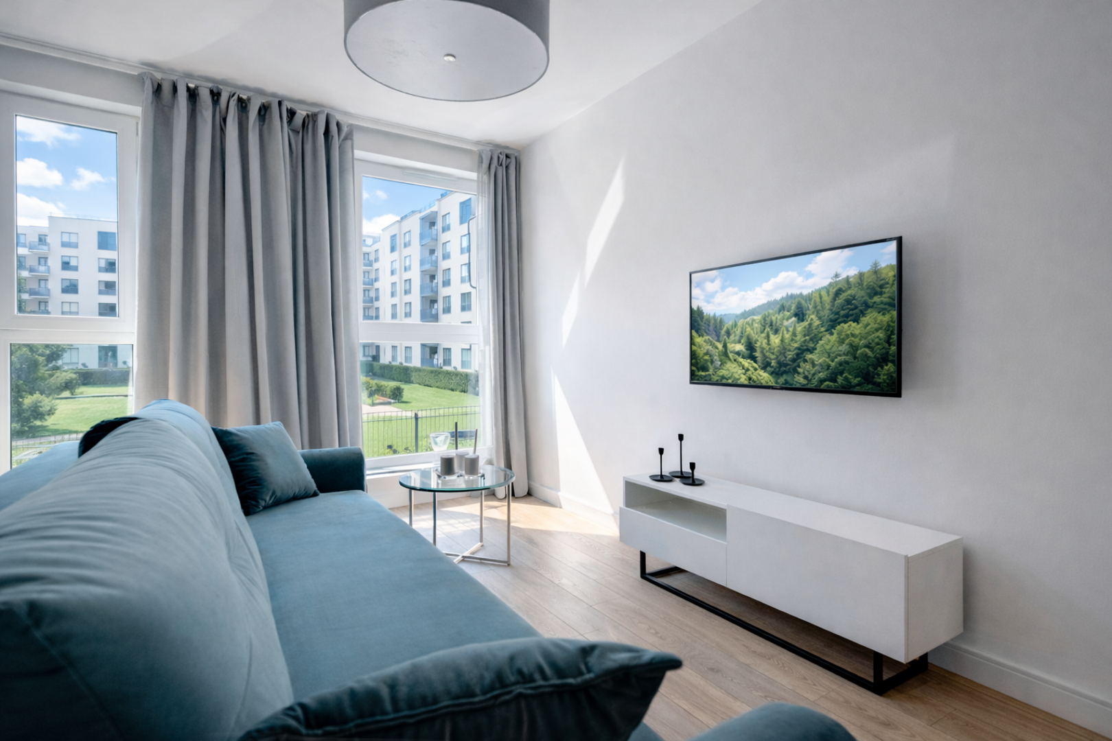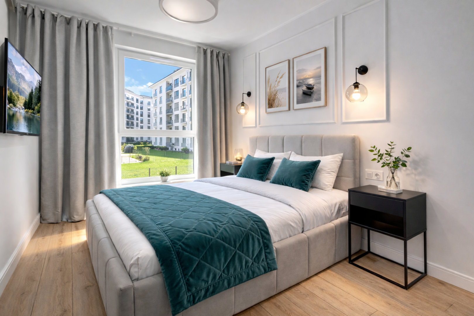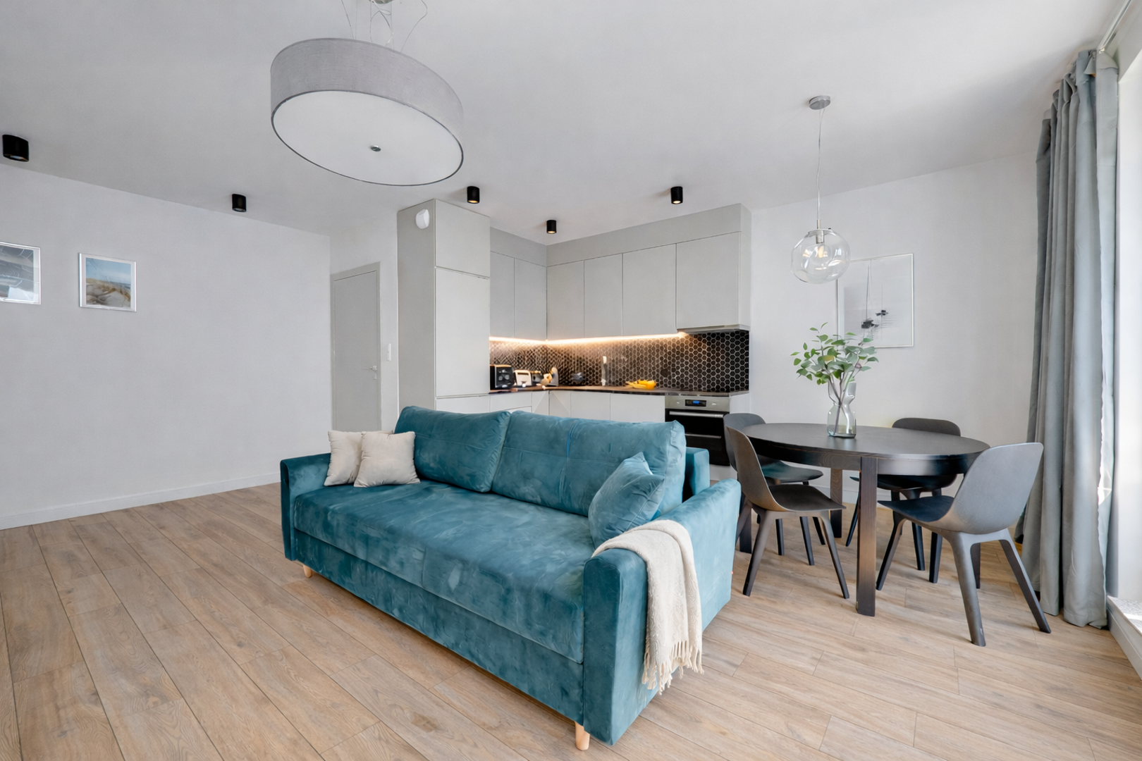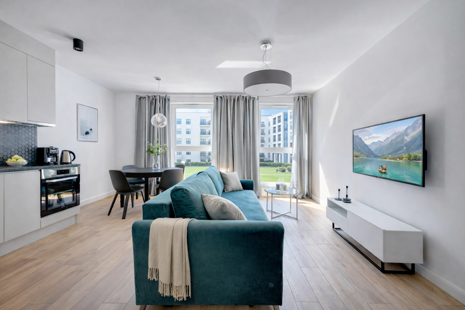 Apartament znajduje się na 1. piętrze i urządzony jest w nowoczesnym, eleganckim stylu. Wnętrze jest jasne, słoneczne i bardzo przyjemne, a duże okna zapewniają dużo naturalnego światła. Mieszkanie oferuje komfortowy salon z rozkładaną turkusową sofą, Smart TV oraz częścią wypoczynkową, oddzielną sypialnię z dużym łóżkiem, funkcjonalną jadalnię, w pełni wyposażoną kuchnię oraz przestronną łazienkę z wanną.