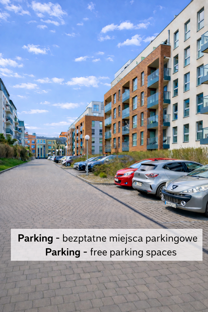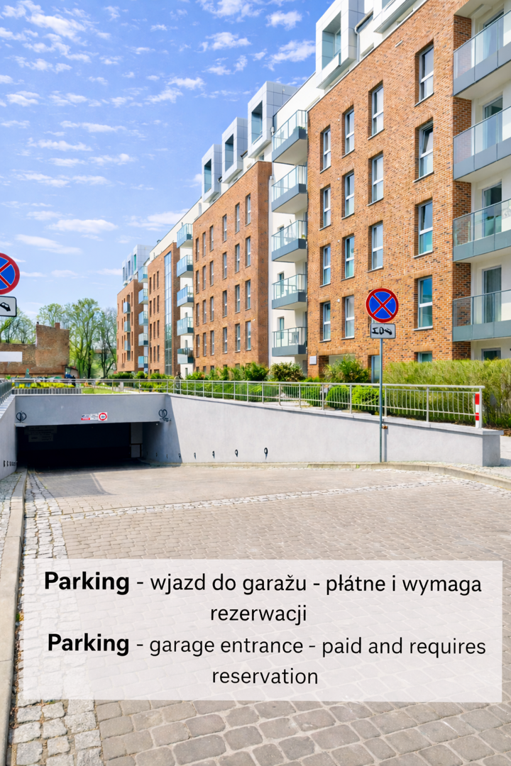 Goście podróżujący samochodem mogą korzystać z bezpłatnego parkowania na wewnętrznej ulicy osiedlowej, ale ilość miejsc jest ograniczona. Dodatkowo pod budynkiem znajduje się parking podziemny - dodatkowo płatny i wymagana wcześniejsza rezerwacja.